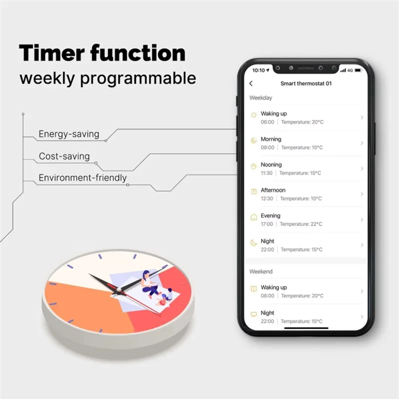 3. Timing function: Set weekly programming according to user needs and habits, automatically adjust the room temperature at a fixed time, and provide a personalized temperature control experience.