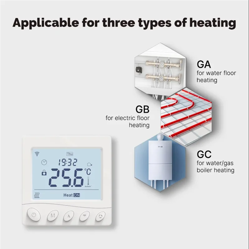 Specification:WiFi GC boiler floor heating thermostat (built-in probe) / WiFi GA water floor heating thermosta (built-in probe) / WiFi GB electric floor heating thermostat (external probe)